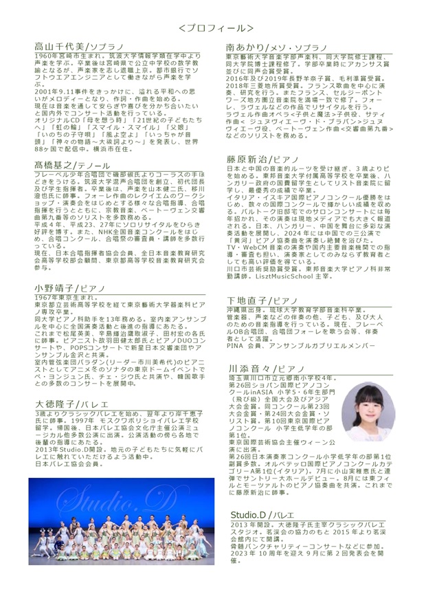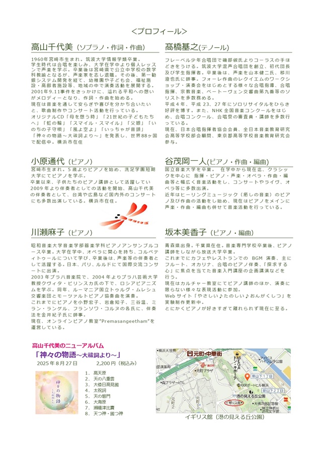 コンサートのお知らせや、出張演奏などについては、ミュージック・ハーベストをご覧ください。歌の泉コンサート・高山千代美ソプラノコンサート、脳トレコンサート、癒しのコンサートなどを行っています。
